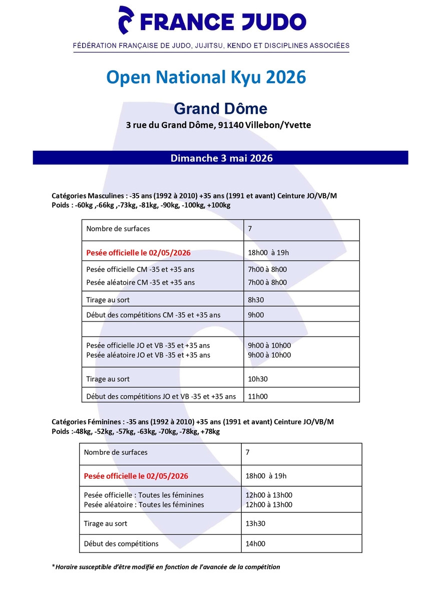 Pesée officielle le 02/05/2026 : 18h00 à 19h